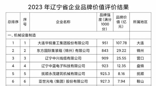 近日,遼寧省品牌建設(shè)促進會聯(lián)合遼寧廣播電視臺發(fā)布了2023年度遼寧省品牌價值評價信息,評價結(jié)果顯示,大連重工以951分(滿分1000分)的品牌強度、107.78億元的品牌價值,位居機械設(shè)備制造企業(yè)榜第一位。